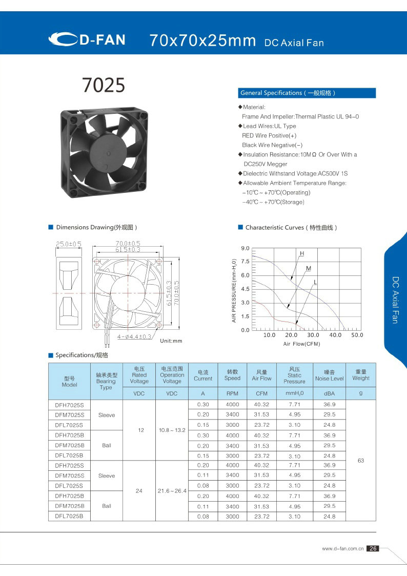 材料: 框架和叶轮:热塑UL 94-0 引线.UL类型 红色导线正极(+) 黑线负极(-) 绝缘电阻:10MΩ或以上,带DC250V高阻表 介电耐压:AC500V 1S 允许环境温度范围: -10℃-+70℃(运行) -40℃-+70℃(储存)