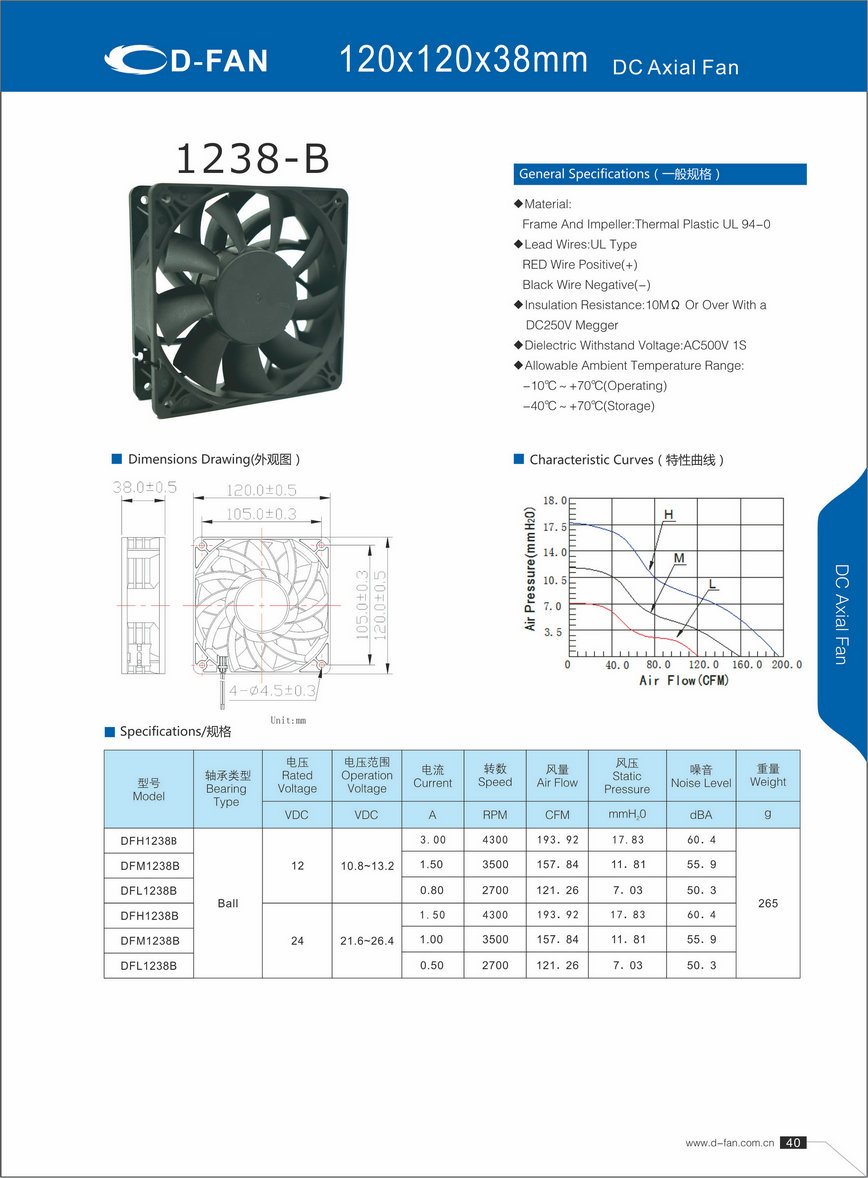 材料: 框架和叶轮:热塑UL 94-0 引线.UL类型 红色导线正极(+) 黑线负极(-) 绝缘电阻:10MΩ或以上,带DC250V高阻表 介电耐压:AC500V 1S 允许环境温度范围: -10℃-+70℃(运行) -40℃-+70℃(储存)