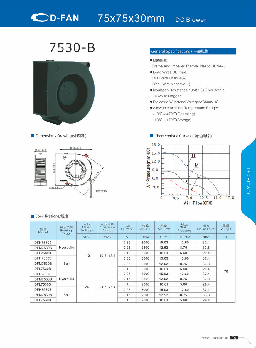 材料: 框架和叶轮:热塑UL 94-0 引线:UL型 红线正极(+) 黑线负极(-) 绝缘电阻:10MΩ或以上,带DC250V高阻表 介质耐压:AC500V 1S 允许环境温度范围: -10℃~+70℃(运行) -40℃~+70℃(储存)